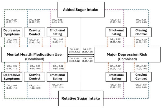 The predictive ability of added and relative sugar intake on the use of mental health medications and the risk for major depression in the combined sample of young adults. The black solid lines represent independent associations between added and relative sugar intake with mental health medication use and risk for major depression. The dashed lines represent the associations after adjusting for other variables presented in the figure. Orange dashed lines stemming from depressive symptoms, craving control, and emotional eating represent the associations between those variables after adjusting for added or relative sugar intake. The colored dashed lines stemming from added and relative sugar intake represent the associations between those variables and mental health medication use and major depression risk after adjusting for the variables they proceed through. Purple dashed lines represent the association after adjusting for emotional eating; blue dashed lines represent the association after adjusting for craving control; green dashed lines represent the associations after adjusting for depressive symptoms. Adjusted (ORadj) and unadjusted (OR) odds ratios are presented alongside their 95% confidence intervals. * Significantly associated at p ≤ 0.050.