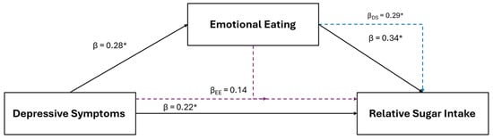 The relationship between depressive symptoms and relative sugar consumption in young adult females and the mediating role of emotional eating. The black solid lines represent independent associations between variables and the dashed intersecting lines represent the associations after adjusting for other variables presented in the figure. Purple dashed lines represent the association after adjusting for emotional eating; the blue dashed line represents the association after adjusting for depressive symptoms. Standardized β coefficients without subscripts represent the standardized coefficients of the independent associations (affiliated with the solid black lines), while standardized β coefficients with subscripts refer to the associations after adjusting for the mediators. * Significantly associated at p ≤ 0.050.