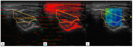 Ultrasound imaging of the cervical multifidus muscle acquired at the C4–C5 level: (A) raw image; (B) fat infiltration calculation; (C) shear wave elastography.