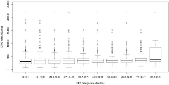 Boxplot showing the distribution of DRG rates in EUR by SIPI categories according to deciles.