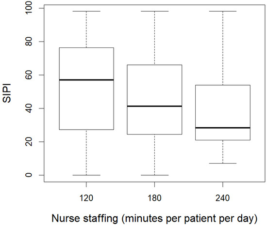 Boxplot showing the distribution of SIPI by nurse staffing (minutes per patient per day).