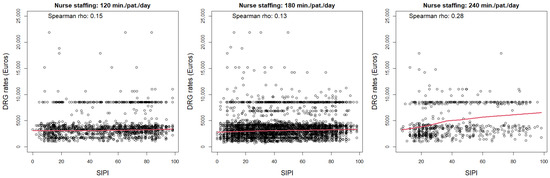 When the relationship between the SIPI, DRG rates, and nurse staffing categories was concurrently assessed, the correlation between SIPI and DRG rates was shown to be very weak across the three nurse staffing categories (Figure 3).