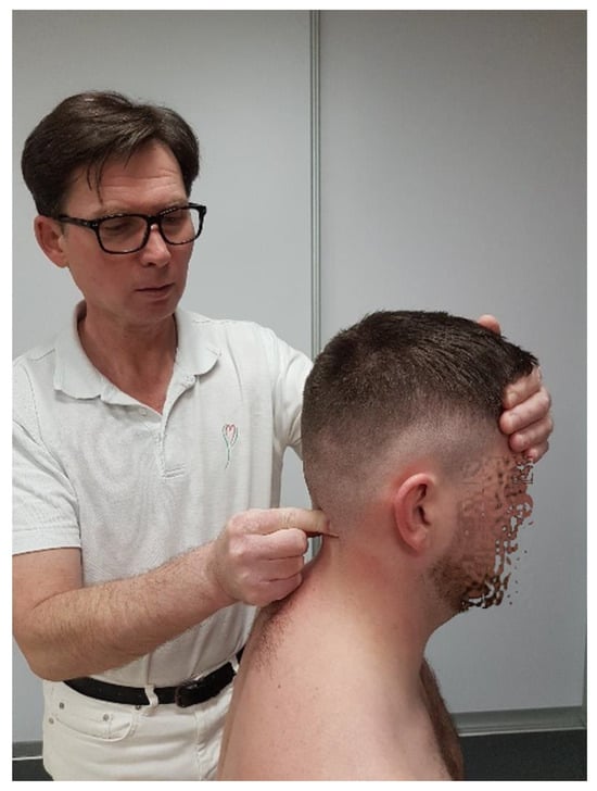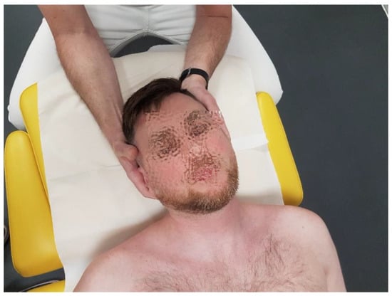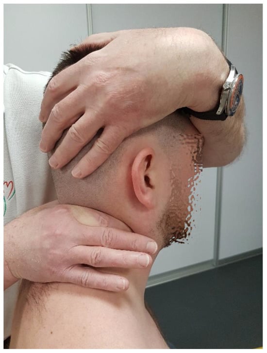 - Flexion/Extension: This refers to the anterior and posterior glide of the occipital condyles on C1, totaling about 30° (10° in flexion and 20° in extension, constituting about 17% of the cervical spine’s flexion range); movement occurs around an axis passing through the external auditory meatuses [18]. The manual testing of the glide range at this level is performed with the patient seated. The therapist first stabilizes the atlas arch by placing one hand over the posterior aspect of the C1 transverse processes. With the other hand, the therapist stabilizes the patient’s head by placing their palm over the occiput and using their fingers to control the mandible. The head is then passively moved in the sagittal plane, maintaining alignment along an axis passing through the external auditory meatuses, with careful application of flexion and extension. The therapist assesses the range of motion (normal range: 10° flexion, 20° extension), tissue compliance, and end-feel resistance using repetitive movements to ensure consistency in the findings (Figure 1).