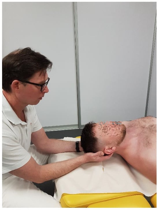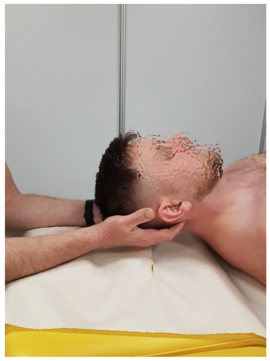 - Rotation: This refers to movement by approximately 5–7° to each side; the movement is coupled with lateral flexion due to the configuration of the C1 articular surface and the forces exerted by the alar ligaments. The manual testing of the glide range at this level is performed with the patient in a supine position. The therapist elevates the atlas arch through its transverse process and assesses the range, quality of motion, and end-feel resistance of the relative posterior glide of the occipital condyle on the same side (Figure 2).