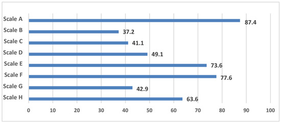 The parameters of the scale A are divided into two groups depending on the accessibility: The first group includes parameters that can be reached on foot in 20 min or less; they are assigned a value of 0. The second group includes parameters that take more than 20 min to reach; they are assigned a value of 1. Respondents needed to choose one of four answers in the questions on the B–G scales: “strongly disagree”, “rather disagree”, “rather agree”, or “completely agree”. Taking into account the different phrasing of the questions on the B–G scales, the respondents answers were divided into two groups: positive and negative aspects of infrastructure. The positive aspects were assigned a value of 0, and the negative aspects were assigned a value of 1. Respondents were asked to assess their satisfaction with various living conditions in the questions of the H scale. The answers were as follows: “strongly dissatisfied”, “somewhat dissatisfied” (value 1 for the corresponding parameter), “uncertain” (respondents who chose this answer were not included in the statistical analysis), “somewhat satisfied”, and “completely satisfied” (value 0 for the corresponding parameter).