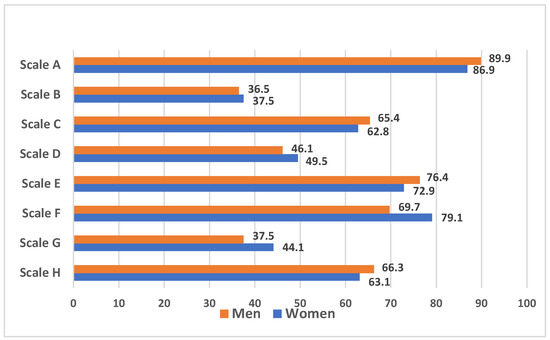 It should be noted that gender differences in the assessment of the parameters of residential areas were noted only for the scale F: women are more dissatisfied with busy traffic than men (79.1% vs. 69.7%; p = 0.002), because it makes it difficult to move along the streets (women, 61.6%; men; 50.0%; (p = 0.001)) (Figure 3).
