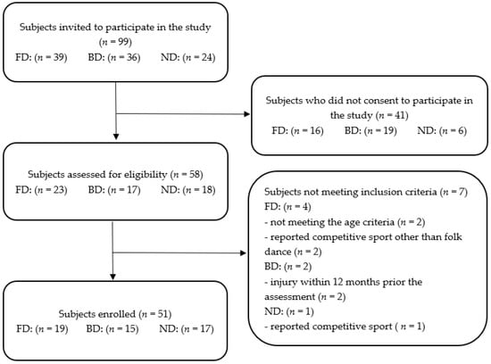 For this observational study, we invited ninety-nine participants living in south-eastern Poland: thirty-nine Polish folk dancers (FD), thirty-six ballroom dancers (BD), and twenty-four non-dancers (ND). Apart from dancing, the participants were high school/university students or white-collar workers. Forty-one participants did not consent to the study so fifty-eight participants were assessed for the eligibility criteria. The inclusion criteria were as follows: (1) given written informed consent to participate in the study, (2) age 18–32, (3) at least 2 years of folk/ballroom dancing experience (dancing groups only), (4) lack of concomitant diseases, lower limbs, and spine injury or surgery within 12 months prior the assessment, or acute inflammation. The exclusion criteria were as follows: (1) lack of written informed consent, (2) age below 18 or above 32, (3) confirmed lower limbs or spine injuries and surgeries within 12 months prior to the assessment, (4) performing competitive physical activity (non-dancers group) or performing competitive physical activity other than folk or ballroom dancing (dancing groups only), (5) performing physical work for a living. Due to eligibility criteria, seven participants were excluded from the study (four FD, two BD and one ND). Finally, fifty-one participants (thirty females and twenty-one males) aged 18–32 were included in the study. The study groups consisted of nineteen FD, fifteen BD and seventeen ND matched to the study dance groups for gender and age. Participants’ flowchart has been shown in Figure 1.