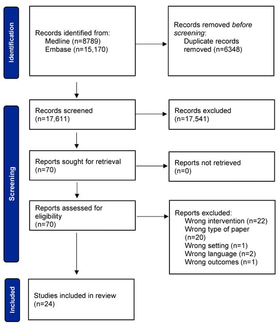 A total of 23,959 records were found via database searches. Figure 1 shows the number of records resulting from each search step. Medline was searched on April 23th 2022 and Embase on April 25th 2022. After the automated removal of duplicates via Covidence [], 17,611 records were manually screened according to title and abstract, resulting in 70 remaining reports. After full-text screening and the exclusion of another 46 reports, the 24 studies from Table 3 were included in the analysis.