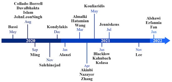 Figure 2 illustrates a timeline of the 24 articles included in our review by publication date. The publication dates range from May 2020 to January 2022. In total, 54.2% (n = 13) of the studies were published in 2021; 33.3% (n = 8) of the studies were published in 2020. The other three studies were published in 2022 (n = 3, 12.5%). The timeline demonstrates how most reviews were published between May 2020 and July 2021, with visibly fewer publications after July 2021.