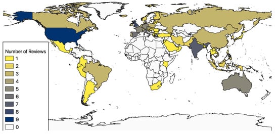 The map shows that most reviews were on apps from the United States (n = 9), the United Kingdom (n = 8), and India (n = 7). Among other origin countries of the analyzed apps are Australia (n = 5), Singapore (n = 4), and Vietnam (n = 4), as well as Canada, Brazil, China, Malaysia, Russia, and the United Arab Emirates (n = 3 each). There were also many European countries (including the United Kingdom, Italy (n = 6), Spain (n = 6), and Germany and France (n = 5 each)). Few reviews analyzed apps from African countries or Central America. Several reviews analyzed apps from more than one country.