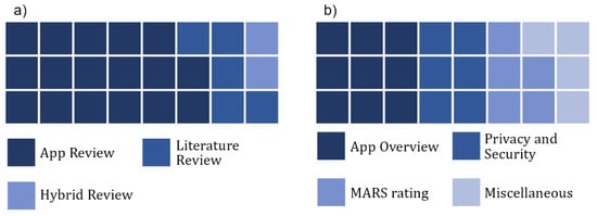 Figure 4a shows how most publications (n = 17; 71%) were reviews of apps followed by literature reviews (n = 5; 21%) and hybrid reviews (n = 2; 8%). We defined hybrid reviews as reviews that include both the literature and apps. We grouped the included reviews into four categories (visualized in Figure 4b). These categories include reviews that provide an overview of published apps (n = 9; 37.5%), focus on privacy and security (n = 6; 25%), and use MARS for rating apps (n = 5; 21%) and those that did not fit into any of the previous categories (n = 4; 16.5%).