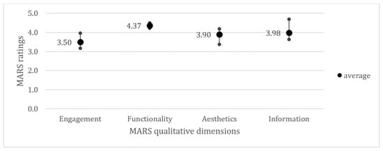 An overview of the average (with minimum and maximum) ratings of MARS dimensions across all five reviews.
