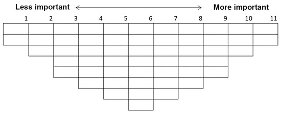 A Q-methodology study was designed to extract the number of viewpoints through statistical analysis of a set of statements, identifying both distinctions and similarities between each viewpoint. This methodology was chosen to explore the link between those who prioritize specific viewpoints of professional identity, aiming for a broader understanding rather than merely categorization. The investigators first explained the Q-sort procedure, provided each participant with a list of Q-set statements along with explanations, and asked them to read before sorting. Participants were then instructed to familiarize themselves with the 54 Q-sort cards and distribute the statements on a Q-sort grid into 3 groups: least important, neutral and most important (Figure 2). The Q-sort grid is a visual table with patterns of distribution on a score sheet, with the number of spaces ranked and columns representing the spectrum from least important (1) to the most important (11) [20,23]. The design requires participants to carefully consider each statement to reflect its true meaning before placing it in each area of the score sheet. A Q-sort is finalized when all statements have been ranked on the Q-sort grid.