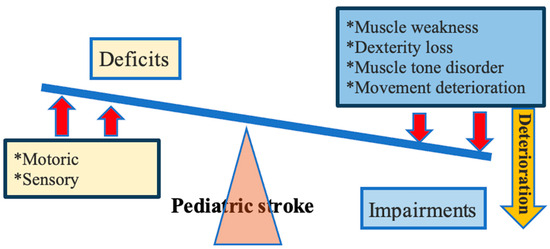Pediatric stroke often leads to lifelong motoric, cognitive, communicational or sensory deficits [11]. In clinical presentation, motoric deficits and/or associated disorders are predominantly observed. Deficiencies may present as a weakness of one arm and/or one leg (in the case of hemiplegia) or weakness of both arms and/or both legs (in the case of quadriplegia or triplegia) [19]. Impairments vary and may include muscle weakness as well as a loss of dexterity, muscle tone disorders and deterioration of the quality and coordination of movements. As motoric and sensory deficits are more severe, impairments are more challenging in patients with pediatric stroke (Figure 2). Even though typical presentation involves hemiparesis, deficits are not exclusively unilateral, especially in the case of hemorrhagic stroke [20]. According to the literature data, the most common type of pediatric stroke is acute ischemic stroke, and the outcomes of this condition are the most studied ones [6].