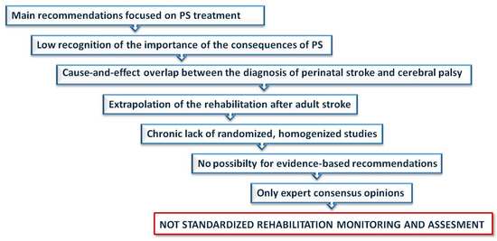 In the literature, the lack of a homogenized group of patients with PS in the context of the success of evidence-based rehabilitation is evident based on a literature search for last 10 years. The search strings that were used included pediatric stroke, arterial ischemic stroke, cerebral sinus venous thrombosis, hemorrhagic stroke, child, childhood, motoric deficit, disability, rehabilitation, physical therapy and outcome. The defined search terms were analyzed in further databases: PubMed, Medline, Scopus and Google Scholar. The search results identified only two reviews [11,62].