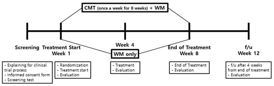 Research process of the study. CMT: Chuna manual therapy; WM: Western medicine; f/u: follow-up.