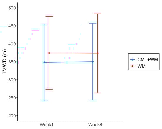 The 6MWD refers to the distance that a patient can briskly walk on a flat and firm surface within a duration of 6 min. It serves as an important measure of daily physical functioning and provides insights into a patient’s functional capacity []. Exercise tolerance is an important predictor of the quality of life and survival rate in patients with COPD. Although there was an increase in the walking distance in the CMT + WM group, the difference was minimal. Upon examining the research process, it was determined that a key variable affecting the study was the change in the individual measuring the 6 MWD during the course of the research. The subsequent measurement confirmed that, contrary to the commencement of the study, the walking distance was shortened by instructing the subjects to walk slowly. To address this issue in large-scale multicenter studies, standard operating procedures (SOPs) are being implemented to create accurate manuals for testers to eliminate bias.