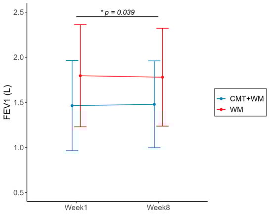 Results for FEV1 (L) from Week 1 to Week 8. FEV1, forced expiratory volume in one second; CMT: Chuna manual therapy; WM: Western medicine. Within each group, the mean difference was calculated as Week 8 minus Week 1, and the difference between the two groups was tested using the Wilcoxon rank-sum test. * p-value < 0.05.