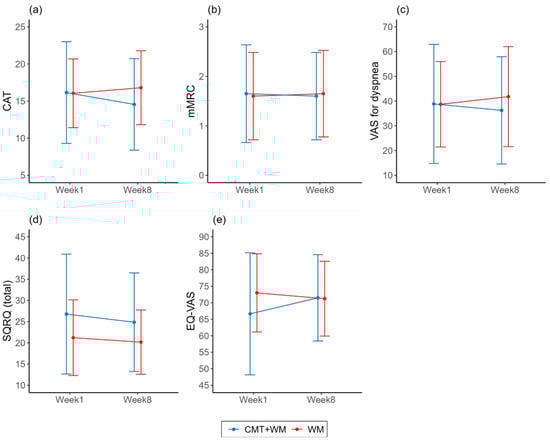 Results for secondary outcome variables from Week 1 to Week 8: (a) COPD Assessment Test (CAT), (b) modified Medical Research Council (mMRC), (c) Visual Analog Scale (VAS) for dyspnea, (d) St. George’s Respiratory Questionnaire (SGRQ) (total), (e) EuroQOL Visual Analog Scale (EQ-VAS). CMT: Chuna manual therapy; WM: Western medicine.