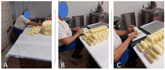 Third, the Key Indicator Method (KIM) was applied. KIM relies on objective indicators, like frequency and duration of movements, weight of loads handled, number of repetitions, etc. [17]. The observer must fill the most relevant KIM forms for a given task, from a range of six options available [18]: LHC (manual Lifting, Holding and Carrying loads), ABP (Awkward Body Postures), MHO (Manual Handling Operations), PP (Pushing/Pulling). Each task was analyzed utilizing the most appropriate KIM form. For example, the “butter packaging” task displayed in Figure 1C corresponded to the MHO KIM form, centered on “manual work”. The BF (Whole Body Forces) and BM (Body Movement) forms were deemed unsuitable for observed tasks. For each form, a KIM score is calculated. This score is derived from the multiplication of a time-rating factor by another factor that is based on various indicators such as posture, force, and frequency. These factors are determined from specific items within each form, which quantitatively represent observed behaviors. For more detailed information, including access to the KIM forms, readers are encouraged to consult reference [19].