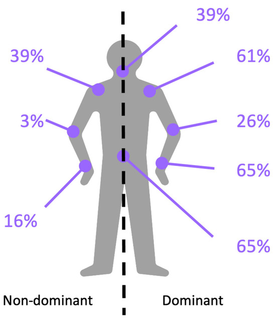 Regarding the location of reported pain represented schematically in Figure 2, it appears that a preponderance of pain localized in the dominant upper limb and the lumbar region is notable. The median number of painful areas reported is two.