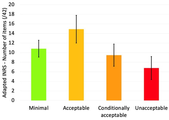 Average number of items (±standard deviation) associated with a minimal, acceptable, conditionally acceptable, or unacceptable risk by the INRS method in the workers observed. The 42 items belong to the following categories: (1) physical efforts (7 + 4 items), (2) dimensioning (7 + 3 items), (3) temporal characteristics (7 items), (4) environmental characteristics (5 items), (5) organization and psycho-social aspects (7 + 2 items).