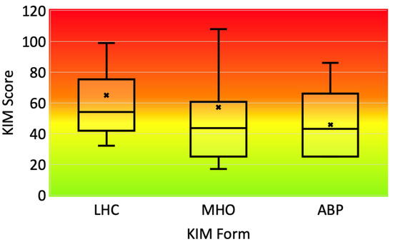 Boxplots summarizing the KIM scores calculated for the various filled forms. The color gradient highlights low-risk (green), intermediate-risk (yellow) and high-risk (red) areas for MSD. PP forms are not displayed since too few of them were filled. Abbreviations: KIM (Key Indicator Method), LHC (manual Lifting, Holding and Carrying loads), MHO (Manual Handling Operations), ABP (Awkward Body Postures). The crosses are the average scores for each form.