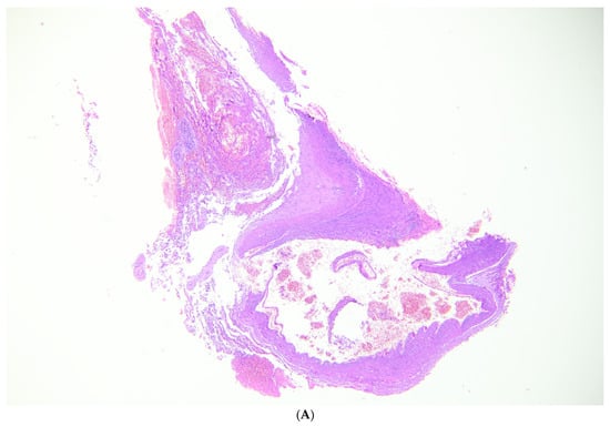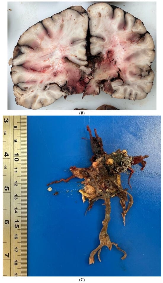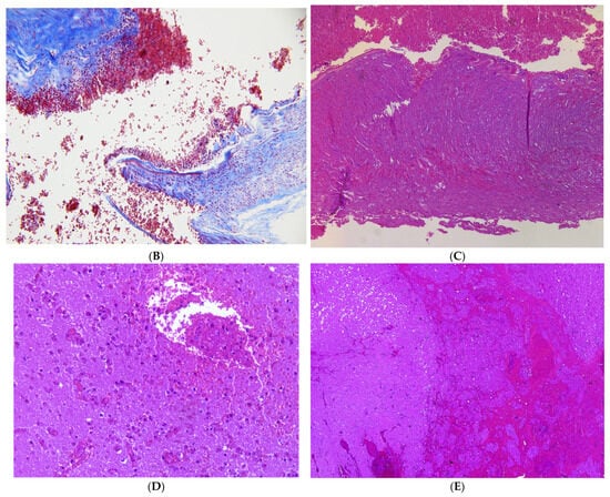 The autopsy revealed an extensive subarachnoid hemorrhage, with a subdural portion, as well as a small, rounded subpial hemorrhage located above the left cortical contusion area. The brain was swollen, with flattened gyri and narrow sulci. On neuropathological examination of the fixed brain, the lesions were confirmed (Figure 2A). Coronal sections showed hemorrhages of the corpus callosum and thalamic nuclei (Figure 2B). The examination of the vessels of the Circle of Willis showed a large blood clot involving the left internal carotid artery and the posterior communicating artery, as well as the presence of a metal coil (Figure 2C). Macroscopically, the posterior communicating artery was ruptured and the internal carotid artery dissected. Within the midbrain, extensive reddish-black hemorrhagic areas were found, indicative of recent hemorrhages (Figure 1D). The edema and increased supratentorial pressure led to hemorrhages, also known as “Duret” hemorrhages, which led to death. Microscopically, the vessels showed both the presence of an aneurysm of the posterior communicating artery and extensive infiltration between the elastic lamina and the connective layer associated with inflammatory cells (Figure 3A). Neutrophils, red blood cells, and fibrin were within the point of the rupture of the aneurysm, but there was no hemosiderin (Figure 3B,C). Samples of the left temporal and parietal cortex showed areas of necrosis, hemorrhage, and edema with neutrophils inside (Figure 3D). In the basal nuclei (Figure 3E) and contralateral cortex, similar findings were observed. The brain changes following a violent attack were the direct consequence of a traumatic aneurysm. Therefore, the case was classified as a homicide.
