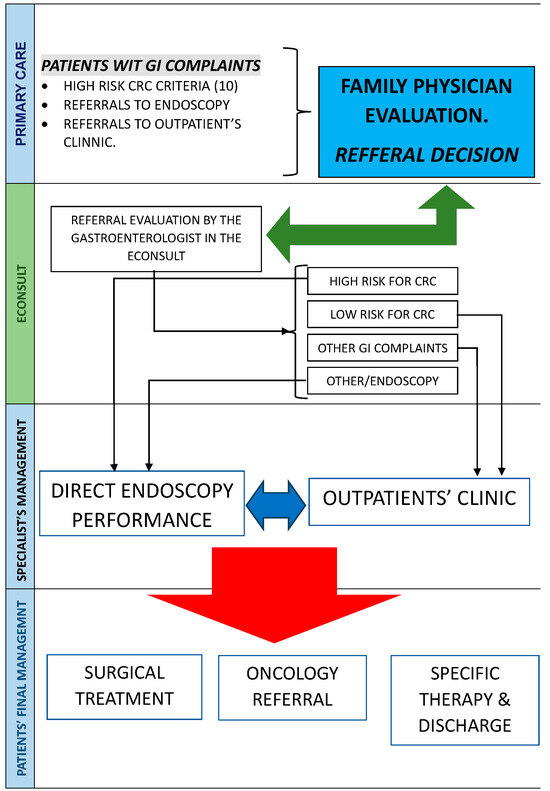 Against this backdrop, the necessity to minimize the risk of exposure has spurred the adoption of novel communication methods with patients and among healthcare providers, notably through electronic consultation (eConsult) and telemedicine [7,8]. These modalities persist as routine tools even beyond the pandemic’s conclusion. The efficacy of eConsults or tele-triage programs facilitating swift specialist consultations has been well-documented in various medical disciplines, including Dermatology or Radiology [9,10,11], and is poised to extend to other domains of medicine. However, their impact on the early diagnosis of gastrointestinal neoplasms has been scarcely assessed [12] even though certain conditions, such as colorectal cancer (CCR), gastric cancer, or esophageal cancer, could benefit from prompt consultations with a general practitioner (GP) that may lead to a diagnostic endoscopic procedure. To accurately and uniformly triage patients for an endoscopic procedure, a prioritizing system is essential. In this context, the Spanish Society of Endoscopy Guidelines for Patient Prioritization developed a system for prioritizing endoscopic referrals to reduce the diagnosis delay of critical gastrointestinal diseases during the pandemic [13]. This system can also be utilized beyond the pandemic setting to prioritize urgent cases, such as those with a high suspicion of gastrointestinal neoplasms or inflammatory bowel diseases. Hence, the integration of eConsults, coupled with a dedicated prioritization system based on symptoms and details, endorsed by primary care providers to assess the urgency of an early colonoscopy, holds promise for reducing diagnosis delays and improving oncological outcomes. The primary objective of this study is to evaluate the delay in CRC diagnosis by comparing referrals to our Gastroenterology department before and after the implementation of eConsults combined with a specific prioritization system. Additionally, we aim to identify the factors influencing tumor stage at the time of diagnosis.