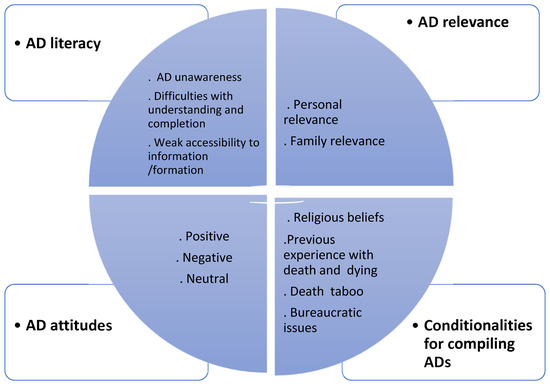 Four categories emerged from the content analysis of the interviews: AD literacy, AD relevance, AD attitudes, and conditionalities for compiling ADs. Additionally, 12 subcategories were extracted, as shown in Figure 1.