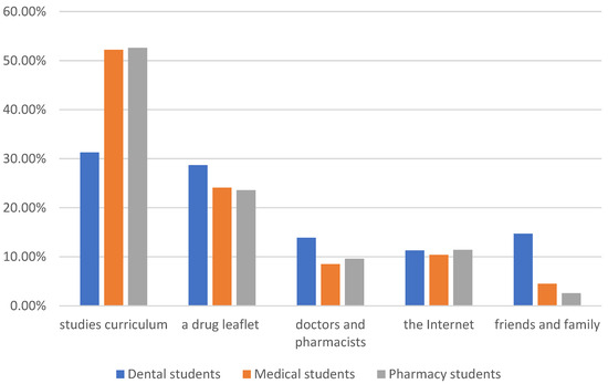 The data obtained in the surveys showed that the use of analgesics is widespread among all the students. There were statistically significant differences in the use of analgesics between the studied groups (p = 0.034) (Table 1). The study showed that students of medicine use painkillers less often than students of other faculties. The obtained data show no relationship between the field of study and adherence to the recommended doses of drugs. There are no statistically significant differences in the pain intensity at which analgesics are used among the surveyed groups of students (p = 0.547). However, there were statistically significant differences in the choice of analgesics and the factors determining this choice among the study groups (p = 0.008). A fast onset of analgesic effect was the most important for 59.1% of dental students, 44.7% of pharmacy students, and for 39.2% of medical students. For medical students, potency turned out to be almost equally important (33.9%). In addition, a long duration of drug action (12.4%) also turned out to be relevant for the surveyed medical students, which makes them stand out from other majors. Drug potency was crucial for (22.6%) of dental students, and for (41.2%) of pharmacy students. There is a statistically significant difference between the surveyed groups of students regarding the side effects of painkillers (p = 0.047). Pharmacy students expressed the least concern about possible side effects (17.5%). In turn, students of medicine and dentistry expressed greater concern about the possible side effects of painkillers (27.4%) and (31.3%), respectively. Among the possible side effects of analgesics application, gastrointestinal complaints were the most often reported, regardless of the surveyed group of students. There was a statistically significant difference in the choice of analgesics for acute pain (p = 0.027). Although ibuprofen was the most frequently chosen over-the-counter painkiller by all the participants in the study, regardless of the field of study, statistically significant differences were found in the use of paracetamol and metamizole. Medical students were statistically more likely to choose paracetamol and metamizole than dental and pharmacy students. All students, regardless of the field of study, do not apply aspirin to fight acute pain. Contraindications to the use of painkillers were declared by 6.02% of the respondents, regardless of the field of study. Students of all study groups were not motivated by advertisements and commercials when choosing painkillers. In turn, there is a statistically significant difference in the indicated source of information regarding painkillers among students of different majors (p = 0.001). More than half of the students of medicine and pharmacy indicated their study curriculum to be their main source of knowledge about painkillers. However, only 31.3% of dental students declared this to be a source of knowledge. Among dental students, a relatively large group, compared to students of medicine and pharmacy, obtain information about painkillers from doctors and pharmacists (13.9%), as well as from friends and family (14.7%). Gaining information on painkillers from a drug leaflet and from the Internet was indicated by a comparable percentage of students of medicine, dentistry and pharmacy (Figure 2).