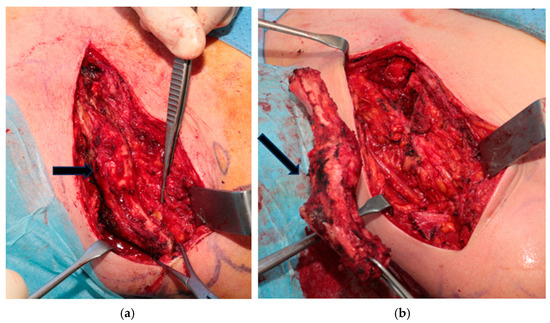 (a,b) Intraoperative images of total clavicular resection. The arrows indicate the clavicle.