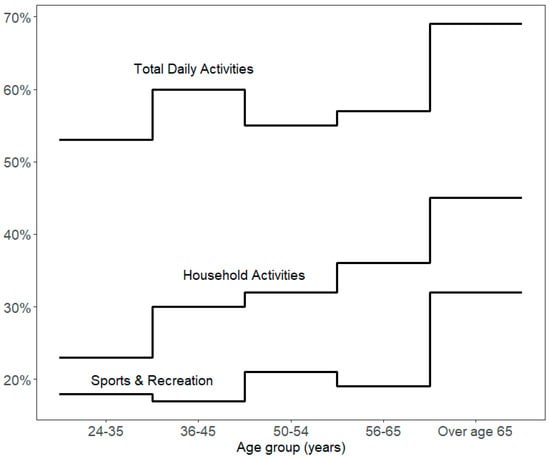 Figure 1 compares 30 min or more of moderate-to-vigorous activity (1) based on all activities reported, (2) based on sports and recreation, and (3) based on household activities. The results are presented as a step curve to illustrate the changing proportions of participants. The upper steps show that more than 50% of participants had more than 30 min of moderate-to-vigorous activity from all the activities they performed during the day. The middle line shows increasing proportions with older age groups from household activities. By comparison, the lower line shows that lower proportions of participants achieved 30 min or more of moderate-to-vigorous activity in sports and recreation. For all three outcomes, people over the age of 65 had the highest activity levels.