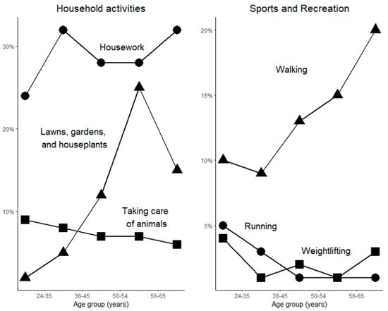Household activities and sports and recreation by age group. On the left panel circles designate housework, triangles represent activities related to lawns gardens and houseplants, and rectangles indicate taking care of animals. On the right panel triangles designate walking, circles designate running, and rectangles indicate weightlifting.