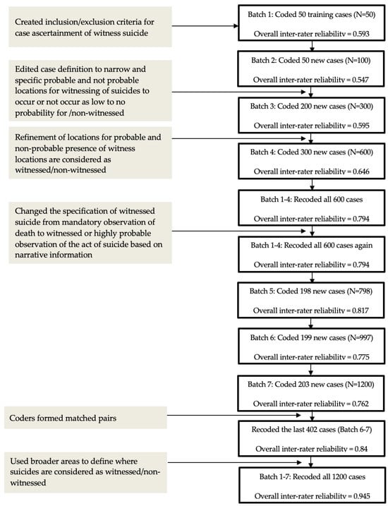 After re-coding Batches One through Four based on refinement of locations, the definition of witnessed suicide was changed from a mandatory observation of the suicide to also include cases in which there was a high probability of observation. After coding all seven batches, the overall inter-rater agreement was still deemed inadequate, so the witnessed suicide locations were broadened to include types of locations from the Federal Bureau of Investigation (FBI) that are used to classify locations of active shooter incidents in the United States [28]. Coder agreement increased with this additional information. After all seven batches were coded, inter-rater agreement for two of the five coders stood out as consistently poor. These two were paired with coders who had high consistencies of coding. In these matched pairs, the inconsistent coder reviewed 25 cases, explained their rationale, and then to listened to the consistent coder’s view of the same case. This process provided the inconsistent coder with feedback and cognitively shifted understanding of the witnessed suicide criteria. Following this entire process, all coders returned to Batches One through Seven to recode any further disagreements; inter-rater reliability for witnessed suicide at this point reached 94.5% agreement. The agreement between the coders was measured using Fleiss’ kappa [29], which is commonly used for categorical outcomes with more than 2 raters. The calculation was performed using the “irr” package in R [30]. Fleiss’ kappa takes values between −1 and 1. Specifically, values between 0.41 and 0.6 are considered as moderate, values between 0.61 and 0.8 are considered as good, and values between 0.81 and 1 are considered as very good. The pattern of coding review is described in Figure 1.
