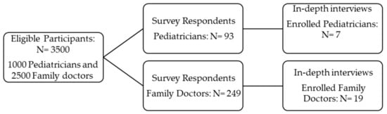 Interviewees were recruited using purposeful sampling. Purposeful sampling is a non-random sampling technique that uses specific criteria or purposes to select a sample []. The aim is to collect in-depth information from the right respondents. The inclusion criteria: pediatrician or family physician working in Clalit. We continued the interviews until theoretical saturation was reached. Signed informed consent was obtained for additional interviews, which were administered to 26 participants of the sample (7 pediatricians and 19 family physicians. See Appendix A) between March and April 2023. The interviews, lasting between forty minutes and an hour, were conducted by one of the authors (TS), who specializes in qualitative research methods in healthcare settings over the phone. Figure 1 describes the study participants in both quantitative and qualitative phases of data collection.