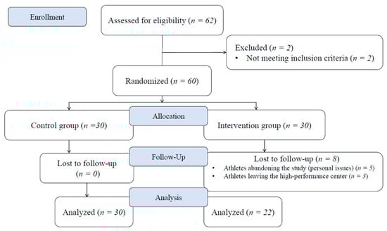 The sample size was calculated using the GRANMO application, Version 7.12 (Spain). Taking a 5% significance level and 80% statistical power, 17 athletes were required for the IG and 17 for the CG to recognize a statistically significant difference greater than or equal to 2.5 points in pain intensity and 5 points in wellness perception. The common standard deviation (SD) was assumed to be 1.7 points in pain intensity and 3.9 points in wellness perception, similarly to previous studies [,]. A dropout rate of 20% was anticipated. With regard to eligibility criteria, the athletes needed to be at least 14 years old and to have 2 years of sports experience to participate in national-level competitions, not to have sustained any injury or any surgery in the last 6 or 12 months, respectively, prior to the beginning of the study, and not to have a chronic disease that could influence muscle pain (i.e., knee osteoarthritis). All athletes from the aforementioned sports center were invited to participate in the study via extensive mailing from their regional sports federation. Of the 62 athletes enrolled, 60 were selected, and 52 athletes finished the study (Figure 1). The training routine was similar for all athletes because they belonged to the same high-performance program in the center. Their training components held a dual focus encompassing both technical–tactical and physical conditioning training. All athletes performed eight or nine training sessions per week. The characteristics of all participants are included in Table 1.