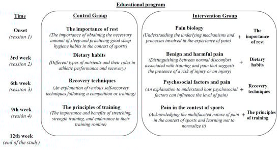 For the CG, the educational sessions provided information and self-care advice on the importance of rest, dietary habits, recovery techniques, and the principles of training based on similar studies focused on athletes [,] (Figure 2).