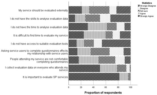 However, over half of respondents (57.1%) also strongly agreed/agreed that collecting evaluation data can be difficult as service users are not always comfortable completing questionnaires. Over one-third of respondents (35.2%)) strongly agreed/agreed that completing evaluation impacts relationship-building with new service users. One participant stated, “Clients do not want to complete more than one well-being form (P32)”.