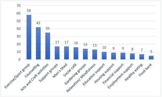 Respondents were asked to identify community-based activities and services to which they frequently refer their service users. Forty-seven different activities and services were identified by seventy respondents (see Figure 2 for top-ranked activities). The most frequently identified activity was exercise and/or sport-related groups (82.8%, n = 58). Counselling was the next most frequently identified community service, followed by arts and crafts activities. Activities and services less frequently used by SP services included referral to healthcare professionals (n = 3), volunteering opportunities (n = 3) and addiction services (n = 2).