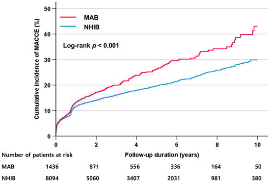 The incidence of MACCE according to the health insurance type. MACCE, major adverse cardiac and cerebral event; MAB, medical aid beneficiary; NHIB, national health insurance beneficiary.