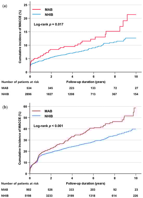 The mean age of study subjects was 66.0 ± 12.3 years, and 5731 (60.2%) were male. The baseline clinical characteristics of the study subjects according to the health insurance type are shown in Table 1. Of the study patients, 1436 (15.1%) were MABs. The MAB group was older (67.4 ± 11.7 vs. 65.7 ± 12.3 years; p < 0.001) and a smaller proportion were male (57.2% vs. 60.8%; p = 0.012) compared to the NHIB group. The MAB group had more cardiovascular risk factors, including hypertension, diabetes, and cigarette smoking, compared to the NHIB group (p < 0.05 for each). Heart failure history was also more frequent in the MAB group than in the NIHB group. The diagnosis of acute myocardial infarction was more frequent in the NIHB group than in the MAB group. For major laboratory findings, hemoglobin and eGFR were lower, and glycated hemoglobin and C-reactive protein were higher in the MAB group than in the NHIB group. Mean LVEF was lower in the MAB group compared to the NHIB group. Among cardiovascular medications, statins were more frequently prescribed in the NHIB group, and angiotensin-converting enzyme inhibitors and beta-blockers were more frequently prescribed in the MAB group.