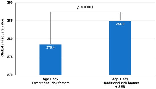 The incidence of clinical events during the follow-up is shown in Table 3. During the median follow-up period of 3.5 years (interquartile range, 1.0–5.9 years), there were 1598 (16.8%) MACCEs. The incidence rate of MACCE was significantly higher in the MAB group than in the NHIB group (20.2% vs. 16.2%, p < 0.001), which was also confirmed in the Kaplan–Meier survival curves (log-rank p < 0.001) (Figure 1). In each component of MACCE, the incidence rates of cardiac death, myocardial infarction, and ischemic stroke were not different between the two groups, but the rate of revascularization was significantly higher in the MAB group than in the NHIB group (10.8% vs. 6.9%, p < 0.001). In the multivariable Cox regression analysis, medical insurance status was independently associated with the occurrence of MACCE during the follow-up period even after adjustment for multiple confounding factors (MAB vs. NHIB groups: hazard ratio (HR), 1.28; 95% confidence interval (CI), 1.07–1.54; p = 0.006) (Table 4). Additionally, insurance status, age, diabetes mellitus, current smoking, reduced LVEF, and the presence of obstructive CAD were associated with the occurrence of MACCE. To determine whether the effect of medical insurance status differs depending on the presence or absence of CAD, clinical events were also analyzed depending on the presence or absence of CAD. The incidence rate of MACCE was significantly higher in the MAB group than in the NHIB group, regardless of the presence or absence of CAD at baseline (log-rank p = 0.017 in patients without CAD, log-rank p < 0.001 in those with CAD) (Figure 2). In subgroups with (MAB vs. NHIB groups: HR, 1.24; 95% CI, 1.02–1.52; p = 0.035) and without (MAB vs. NHIB groups: HR, 1.52; 95% CI, 1.01–2.29; p = 0.047) CAD at baseline, medical insurance status was independently associated with the occurrence of MACCE during the follow-up period (Table 5). The global chi-square values of Cox regression analyses were compared to evaluate the incremental prognostic value of insurance status when it was added to age, sex, and traditional clinical factors, including diabetes mellitus, hypertension, dyslipidemia, and smoking status. The addition of traditional clinical risk factors to age and sex had incremental prognostic value for predicting MACCE (global chi-square value, from 136.6 to 278.4; p < 0.001). The addition of SES to combined use of age, sex, and traditional clinical factor results further increased the predictive power for MACCE (global chi-square value, from 278.4 to 284.9; p < 0.001) (Figure 3).