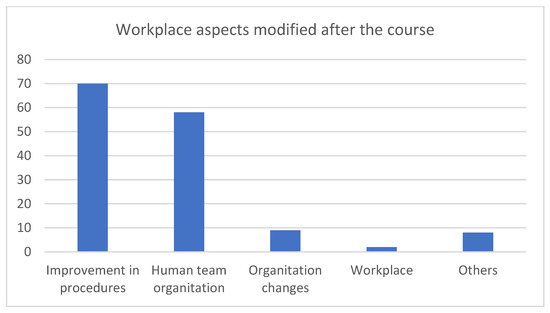 The variable about the aspects modified in the workplace after completing the course was followed by a conditional question: if the response was affirmative, a second closed-answer question was shown to address five aspects (improvement in procedures, organization of the health team, changes in the organization, changes in the workplace or other). These five aspects are usually analyzed as triggers in the analysis of adverse events associated with health care [27].