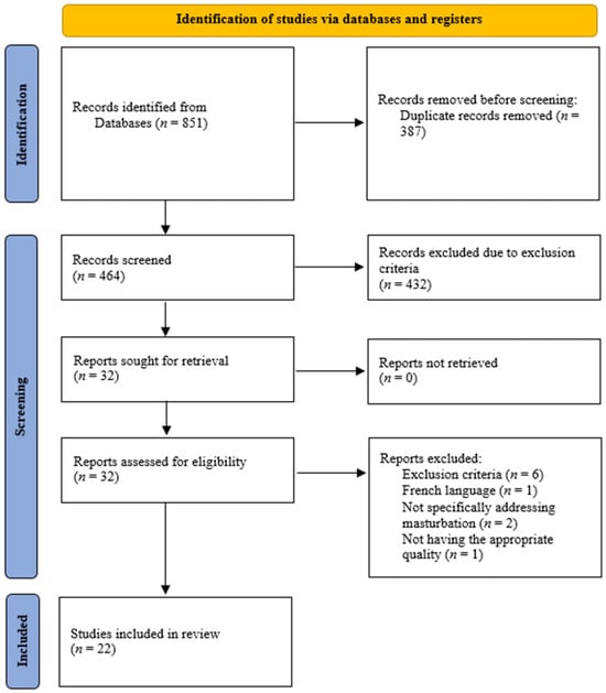 The database search yielded 851 records (see Supplementary Data S1). After eliminating duplicates, 464 records remained according to their title, abstract, and keywords. Of these, 432 records were excluded due to the exclusion criteria. A total of 32 underwent a full-text examination, and, finally, 10 were eliminated because they did not meet the inclusion criteria. To broaden the selection process, although a search was made for the papers cited in the studies to be considered, none of them were included. This left 22 papers that met the inclusion criteria and methodological quality standards and could, therefore, be included in the present systematic review. Figure 1 shows a flow chart of the selection process for these studies.