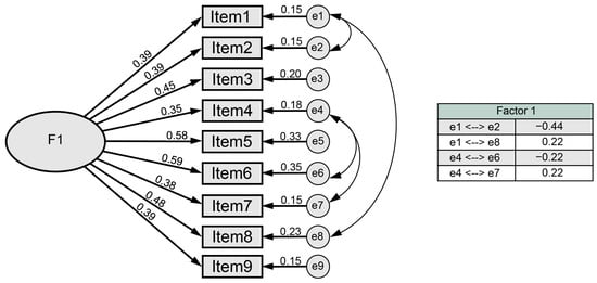 Initially, the RULS approach was able to determine a monofactorial structure for the questionnaire through the explained variance based on eigenvalues [] and the reliability of expected a posteriori scores (EAPs) [], finding a score of 3.29 for the eigenvalue of this single factor as well as a variance proportion of 0.36. Additionally, positive results were obtained from the sampling adequacy indicators (KMO test = 0.79855 and Bartlett’s test = 814.9; df = 36; p = 0.000), confirming the feasibility of the EFA (refer to Appendix A, Table A2 for the polychoric correlation matrix). Subsequently, and due to the unidimensional nature of the scale, no rotation mechanism was chosen to run the EFA, resulting in a load matrix of nine items (Table 2).