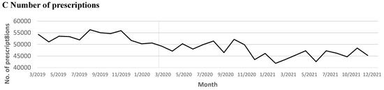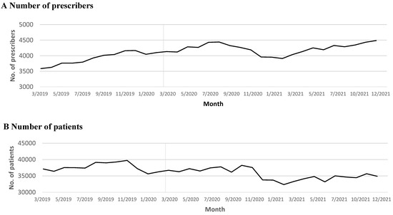 We delineated the “pre-pandemic period” as the year spanning from 19 March 2019 to 18 March 2020, which coincided with the commencement of the statewide stay-at-home order. Subsequently, the “pandemic period”, encompassing 21 months, extended from 19 March 2020 to 18 December 2021. We assessed various outcomes every month during both these periods, which included (1) the monthly volume of patients filling buprenorphine prescriptions, (2) the monthly volume of buprenorphine prescription refills, (3) the monthly volume of prescribers involved, (4) the mean days’ supply per prescription, and (5) the mean daily dosage among patients filling buprenorphine prescriptions each month. To maintain result accuracy, we excluded certain buprenorphine product formulations, such as extended-release solutions, implants, powders, and those labeled for analgesic purposes. Daily buprenorphine doses range from 8 mg to a maximum of 24 to 32 mg [31,32]. We excluded prescriptions with excessive daily amounts exceeding 50 mg.