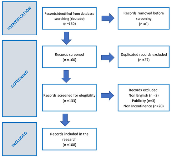 On 22 March 2023, a search was conducted on the website http://www.youtube.com with the search terms “Incontinence after cancer surgery”. An initial cohort of 160 videos was selected from the available options, to reproduce a simple search approach executable by any person. YouTube ranked the video results based on relevance using their proprietary algorithm on the specified date. All videos were then compiled into a spreadsheet and screened for duplicates. The research team applied the exclusion criteria, eliminating non-English language videos, duplicates, advertisements, and content unrelated to incontinence. Finally, 108 videos were assigned to two independent examiners who viewed, analyzed, and evaluated them over a three-week period, as depicted in the flow diagram adhering to PRISMA guidelines [33,34] (see Figure 1).