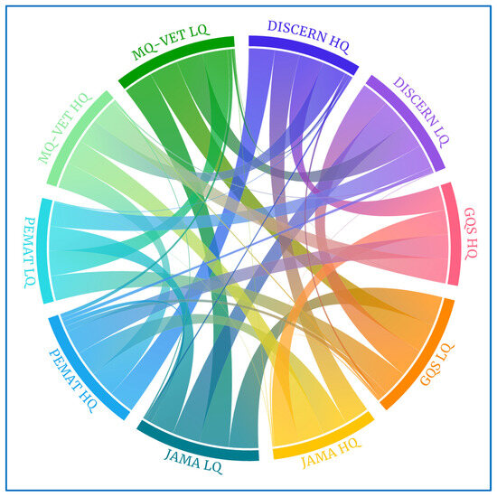 These correlation coefficient data can be graphically understood in the Sankey and chord diagrams below. The chord diagram of the scores received by the videos categorized in each of the scales examined is shown in Figure 2. The groups on the periphery display movies with scores of high quality (HQ) and low quality (LQ) on each of the scales analyzed in this study. The band’s widths that connect the groups reflect the number of videos that receive the score indicated in the name of the two groups that each band connects.