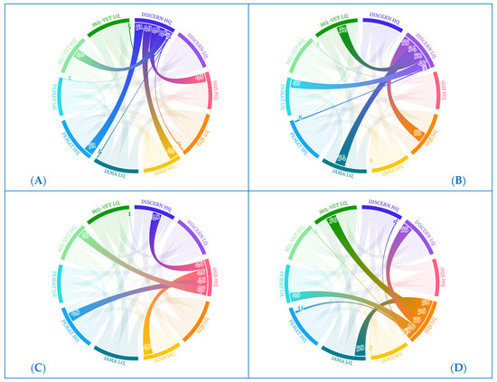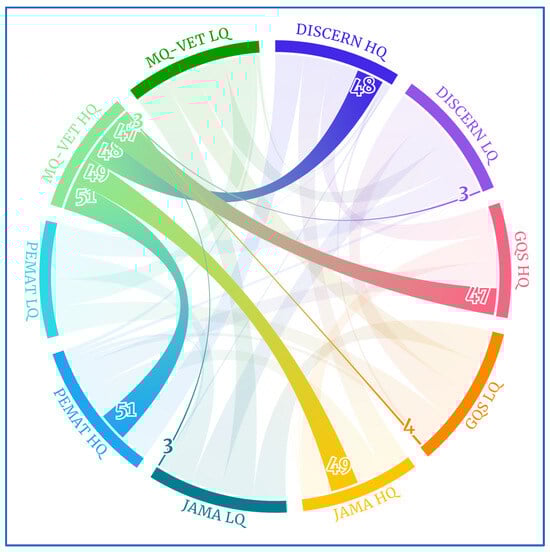 In this health research study, we conducted Pearson’s correlation analysis to examine the relationships among the quality rating scales, which include DISCERN, GQS, JAMA, PEMAT, and MQ-VET. As previously mentioned, our rigorous statistical analysis revealed robust, highly significant positive correlations (with p-values < 0.01) among these scales, indicating a remarkable level of consistency and convergence across the various evaluation criteria. To further emphasize and visually represent these strong interconnections, we employed chord diagrams. Within these diagrams, it was evident that samples receiving high ratings on one quality scale also tended to receive high ratings on the other scales, reinforcing the coherence in our assessments. Conversely, samples with low-quality ratings on one scale consistently exhibited low ratings across all the other scales. These chord diagrams provided a vivid graphical depiction of the pronounced correlations identified in our statistical tests. Notably, only a few samples, as indicated in Table 5, displayed variations in their ratings across different scales, which were not statistically significant.